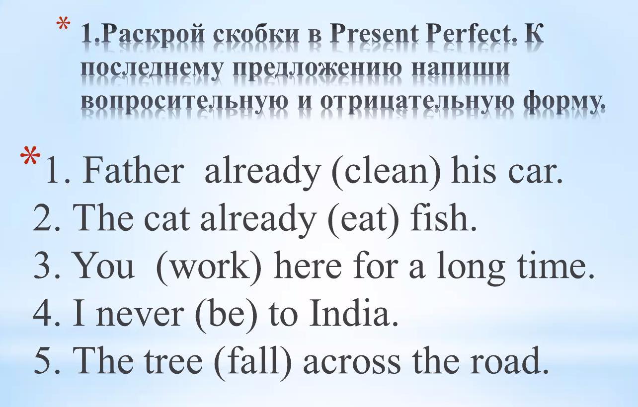1. the father is already cleaning his car. 2. the cat is already eating fish. 3. you have been working here for a long time. 4. I never go to India. 5. a tree falls across the road.