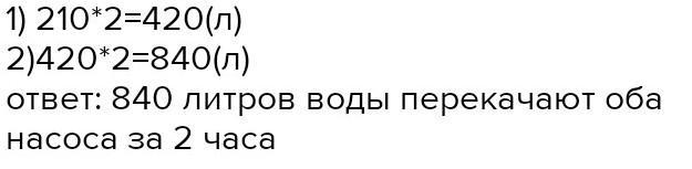 Для роботы фонтана каждый из двухнососов перекачивает по 210 литров воды в час. Сколько воды перекачают оба насоса за 2 часа. Решение,ответ,краткая запись срочно надо!