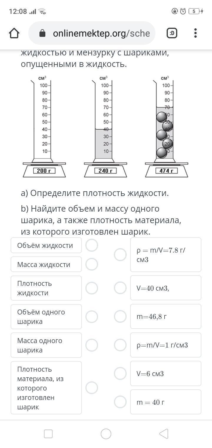Ответ: плотность шарика - 7,8 г/см3, объем одного шарика - 6 см3, масса одного шарика = 46,8 г, плотность жидкости=1 г/см3, масса жидкости = 40 г