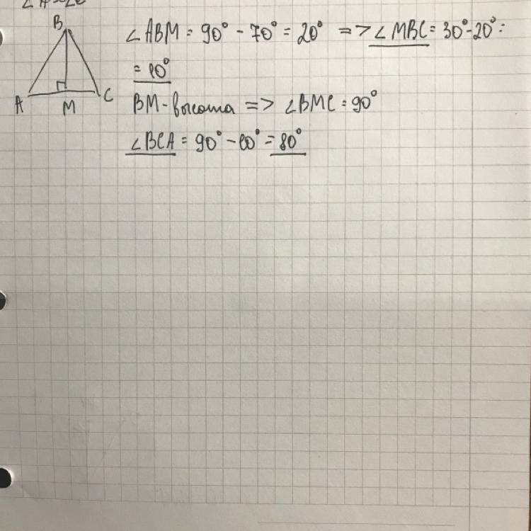 В треугольнике АВС точка М – середина стороны АС, ВМА=90°, АВС=30°, ВАМ=70° НАЙДИТЕ МВС и ВСА