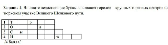 Впишите недостающие буквы и названия городов - крупных торговых центров на тюрском участке Великого Шелкого пути 1. Т_р__ 2. О__а_ 3. С ы ____ 4. И ____ ж __