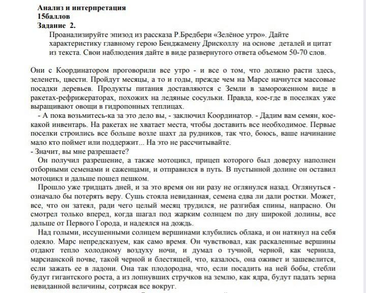 Космический рассказ Рея Бредбери "Зелёное утро" отправляет нас на планету Марс. Но главным героем в нем является человек с планеты земля. Поступки, которые он совершает очень близки нам, землянам. Гуманизм его поступка почувствует на себе первопоселенцы, они смогут дышать. Главная цель, которую поставил перед собой герой, нужна не только ему.