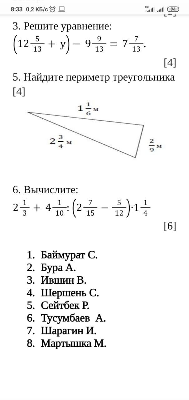 5. 1 1/6+2/9+2 3/4 = 4 5/36 м (4 целых, 5 тридцать шестых