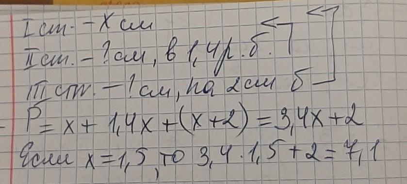 Составите выражение к задаче и найдите его значение: В труегольнике одна из сторон равна <х> см, вторая сторона в 1,4 раза больше, чем первая сторона, а третья на 2 см больше, чем первая. Чему равен периметр треугольника, если х=1,5.