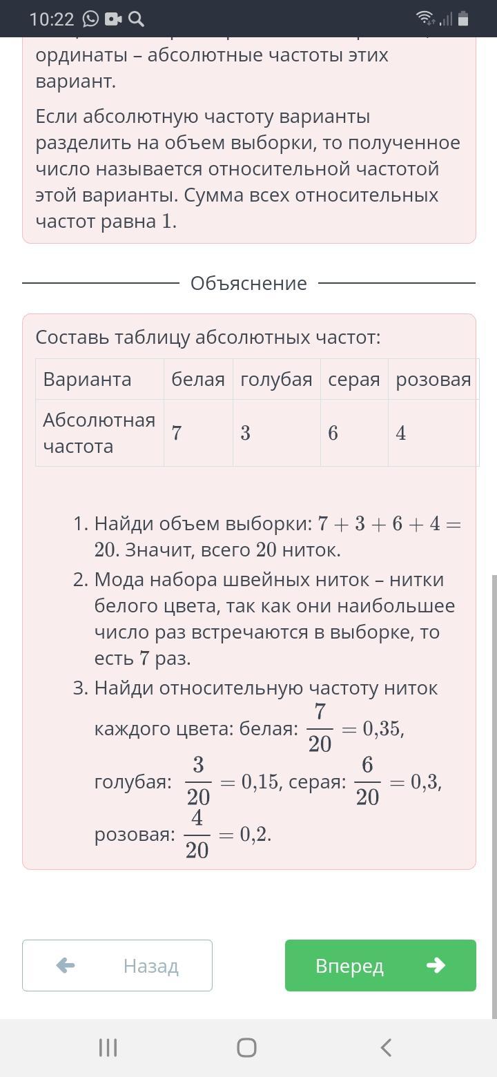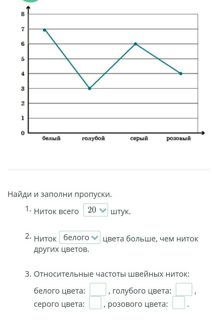 Относительные частоты швейных ниток: белого 0,35; голубого 0,15; серого 0,3; розового 0,2