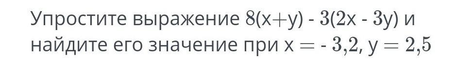 Упростите выражение 8(x + y) - 3(2x - 3y) и найдите его значение при x = - 3, 2 , y = 2, 5