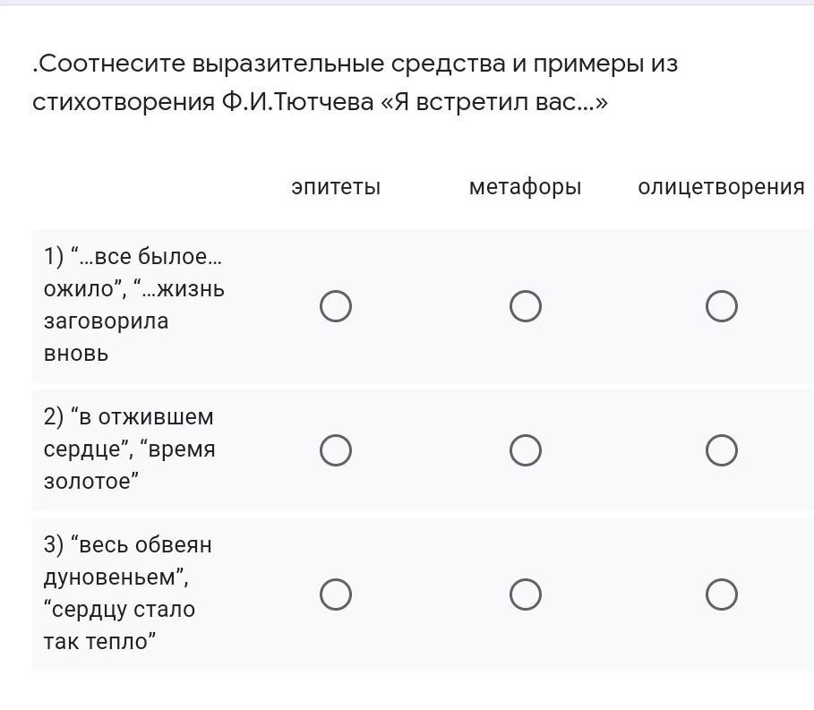 Соотнесите выразительные средства и примеры из стихотворения Ф.И.Тютчева «Я встретил вас…»