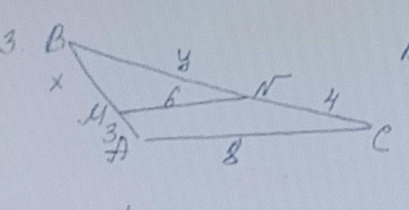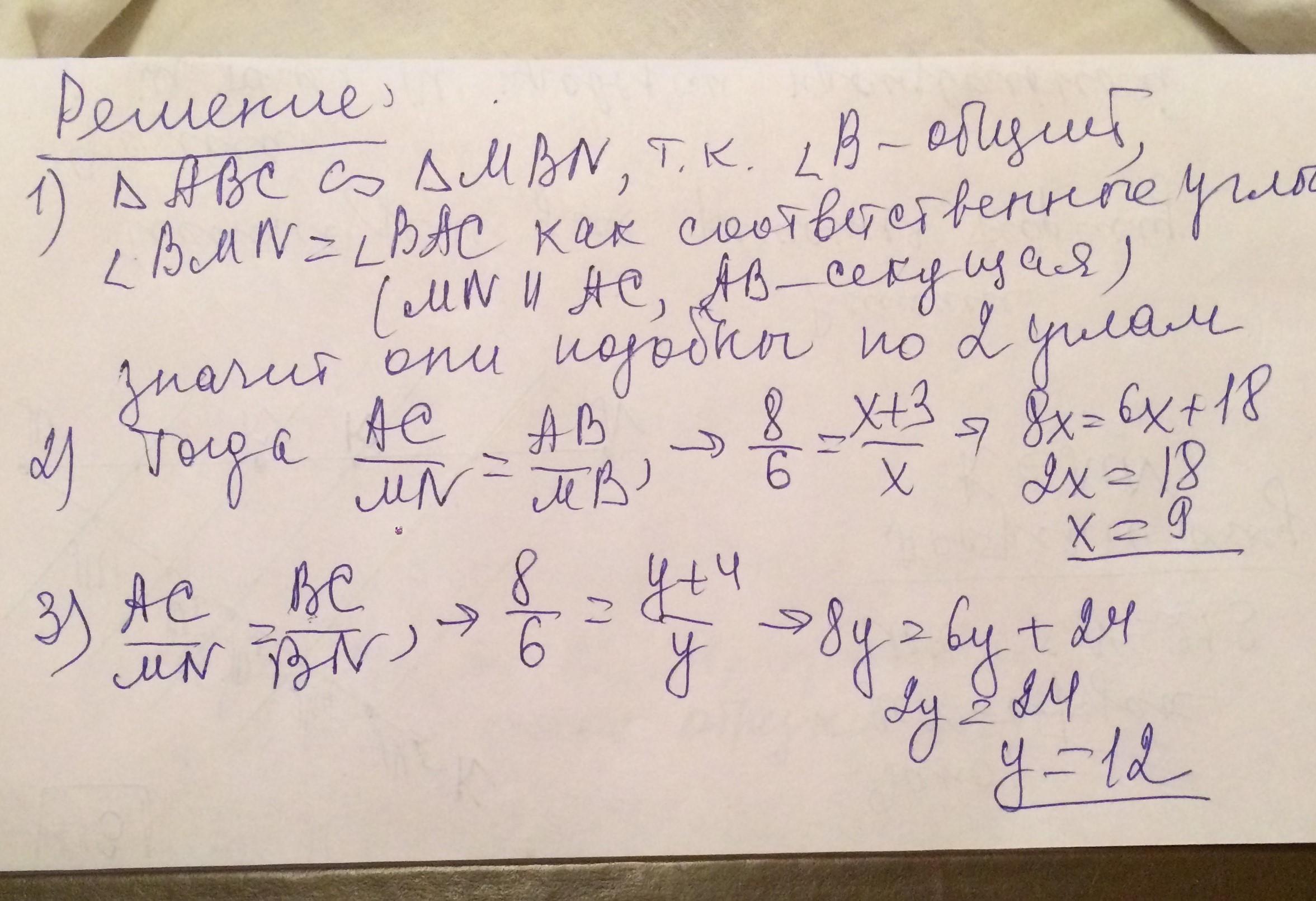 УМОЛЯЮ!!В треугольнике АВС МН параллелен АС найдите х и у.плиззззз!!!!Дам 30 баллов лучшему