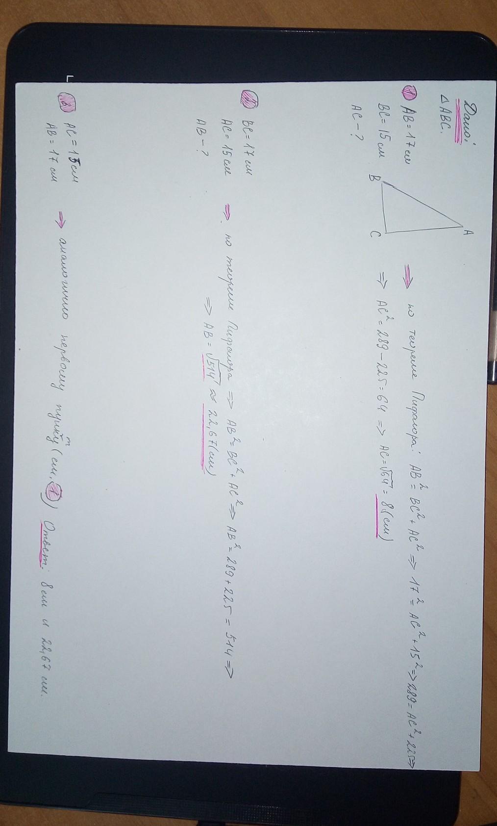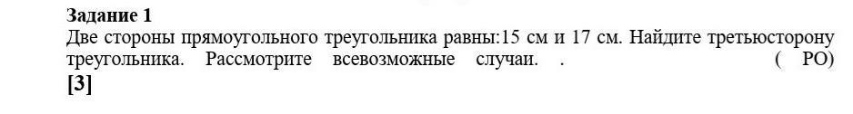 Две стороны прямоугольного треугольника равны:15 см и 17 см. Найдите третьюсторону треугольника. Рассмотрите всевозможные случай,,