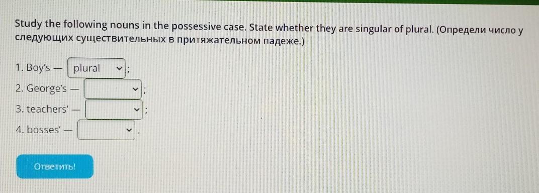 1. Boy's - Plural (мн.ч)2. George's - Singular (ед.ч)3. Teachers' - Plural (мн.ч)4. Bosses' - Plural (мн.ч)