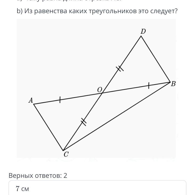 Отрезки АВ и СD пересекаются в точке О,которая является серединой каждого отрезка. ОВ=7 см, ВD=4см.