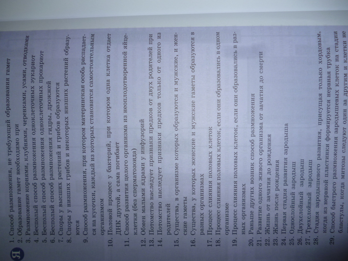1) способ размножения,не требующий образования гамет 2) образование гамет необходимо при 3) размножение корнями,клубнями,черенками,усами,отводками 4)бесполый способ размножения одноклеточных эукариот 5) бесполый способ размножения одноклеточных прокариот 6) бесполый способ размножения гидры,дрожжей 7) споры у высших растений и грибов образуется 8) споры у низших грибов и некоторых низших растений образуются 9) способ размножения, при котором материнская особь распадается на кусочки, каждый из которых становится самостоятельным организмом 10) половой процесс у бактерий, при котором одна клетка отдает ДНК другой,а сама погибает 11) способ развития целого организма из неоплодотворенной яйцеклетки (без сперматазоида) 12) обмен малыми ядрами у инфузорий 13) потомство наследует признаки предков от двух родителей при 14) потомство наследует признаки предков только от одного из родителей 15) существа, в организме которых образуется и мужские, и женские гаметы 16) существа, у которых женские и мужские гаметы образуются в разных организмах 17) процесс слияния половых клеток 18) процесс слияния половых клеток, если они образовались в одном организме 19) процесс слияния половых клеток, если они образовались в разных организмах 20) раньше других возник способ размножения 21) развитие одного живого организма от зачатия до смерти 22)жизнь от зачатия до смерти 23)жизнь после рождения 24)первая стадия развития зародыша 25)однослойный зародыш 26)двухслойный зародыш 27)трехслойный зародыш 28) стадия зародышевого развития присущая только хордовым когда из нервной пластинки ормируется нервная трубка 29) способ быстрого размножения зародышевых клеток на стадии бластулы когда митозы следует один за другим и клетки не успевают расти