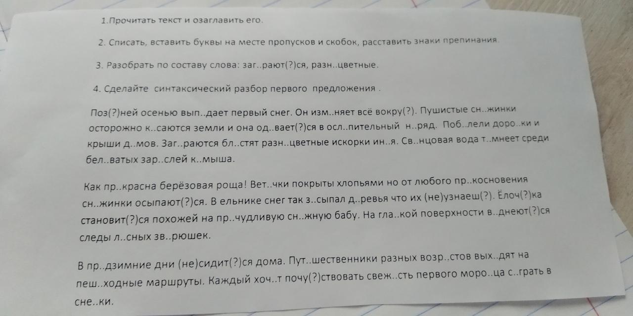 2. Поздней осенью выпадает первый снег. Он изменяет все вокруг. Пушистые снежинки осторожно касаются земли, и она одевается в ослепительный наряд. Побелели дорожки и крыши домов. Загораются, блестят разноцветные искорки инея. Свинцовая вода темнеет среди беловатых зарослей камыша.