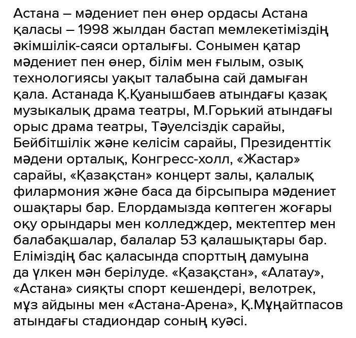 выполните письменную работу. Напишите слова по правилам орфографии, правильно соедините суффиксы, используйте знаки препинания в конце предложения. Текст должен быть не менее 50-70 слов, на тему Астана – мәдениет пен өнер ордасы пж помогите это СОЧ