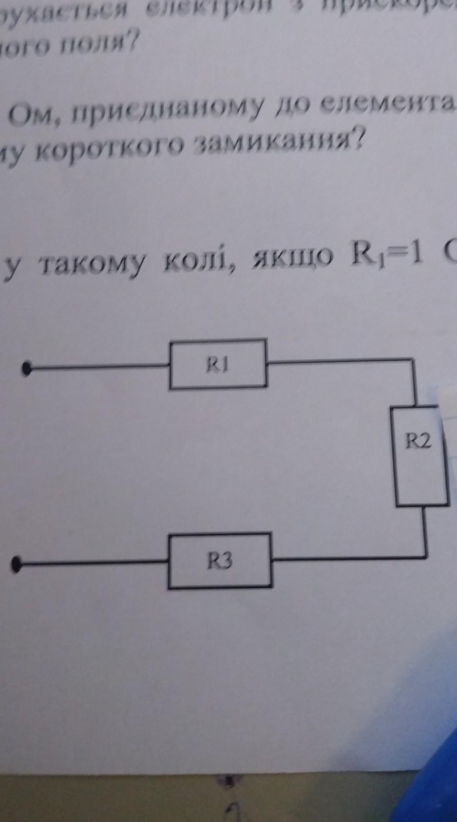 Визначити силу струму у такому колі,якщо R1=1 Ом, R2=2 Ом, R3=3 Ом , а напруга на кінцях 12В