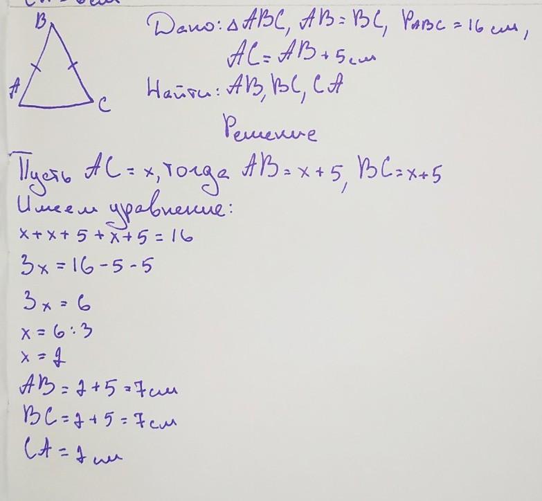 В равнобедренном треугольнике основана 5 см меньше чем боковая сторона, а периметр равен 16 см Найдите стороны треугольника