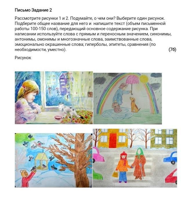 Рассмотрите рисунки 1 и 2. Подумайте, о чем они? Выберите один рисунок. Подберите общее название для него и напишите текст (объем письменной работы 100-150 слов), передающий основное содержание рисунка. При написании используйте слова с прямым и переносным значением, синонимы, антонимы, омонимы и многозначные слова, заимствованные слова, эмоционально окрашенные слова; гиперболы, эпитеты, сравнения (по необходимости, уместно). (7б)