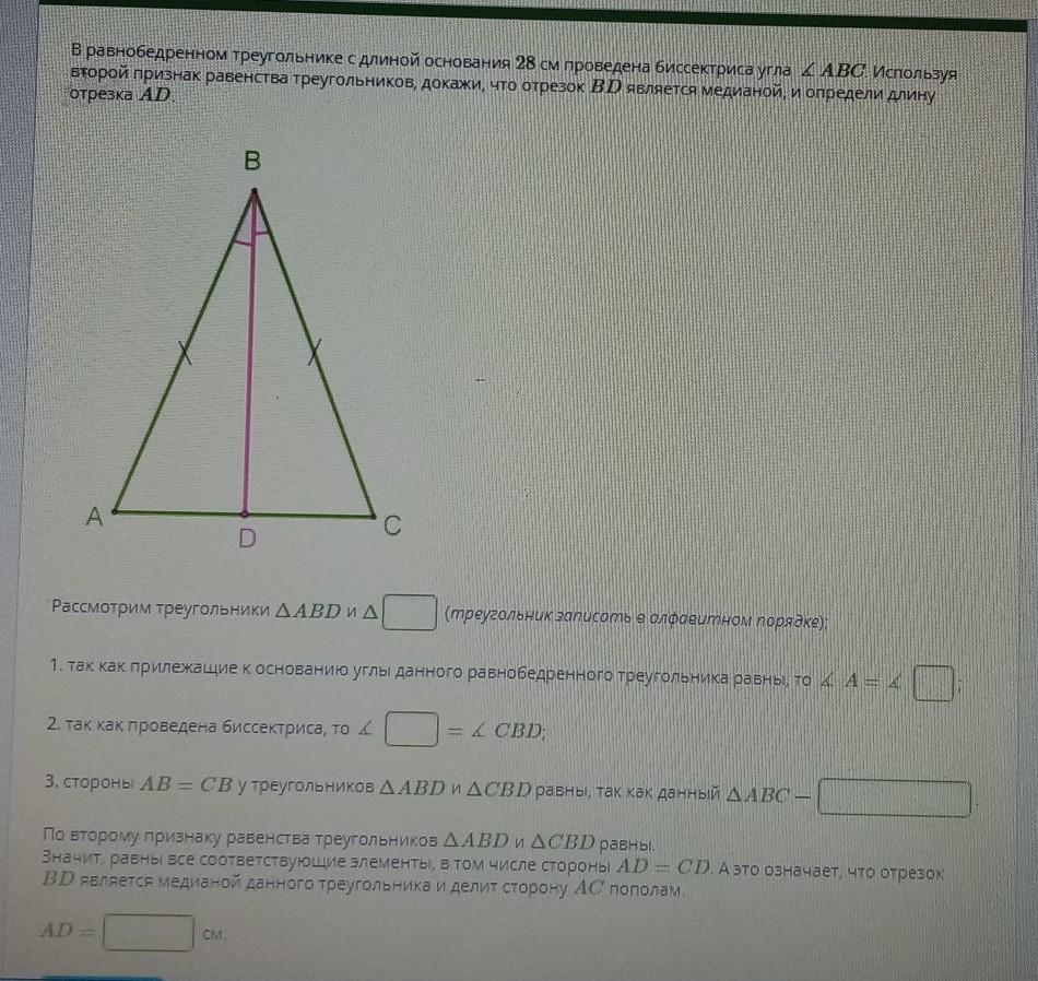В равнобедренном треугольнике длина основания 28 см проведена биссектриса угла ABC используя второй признак равенства треугольников, докажите, что отрезок BD является медианой и определи длину отрезка AD