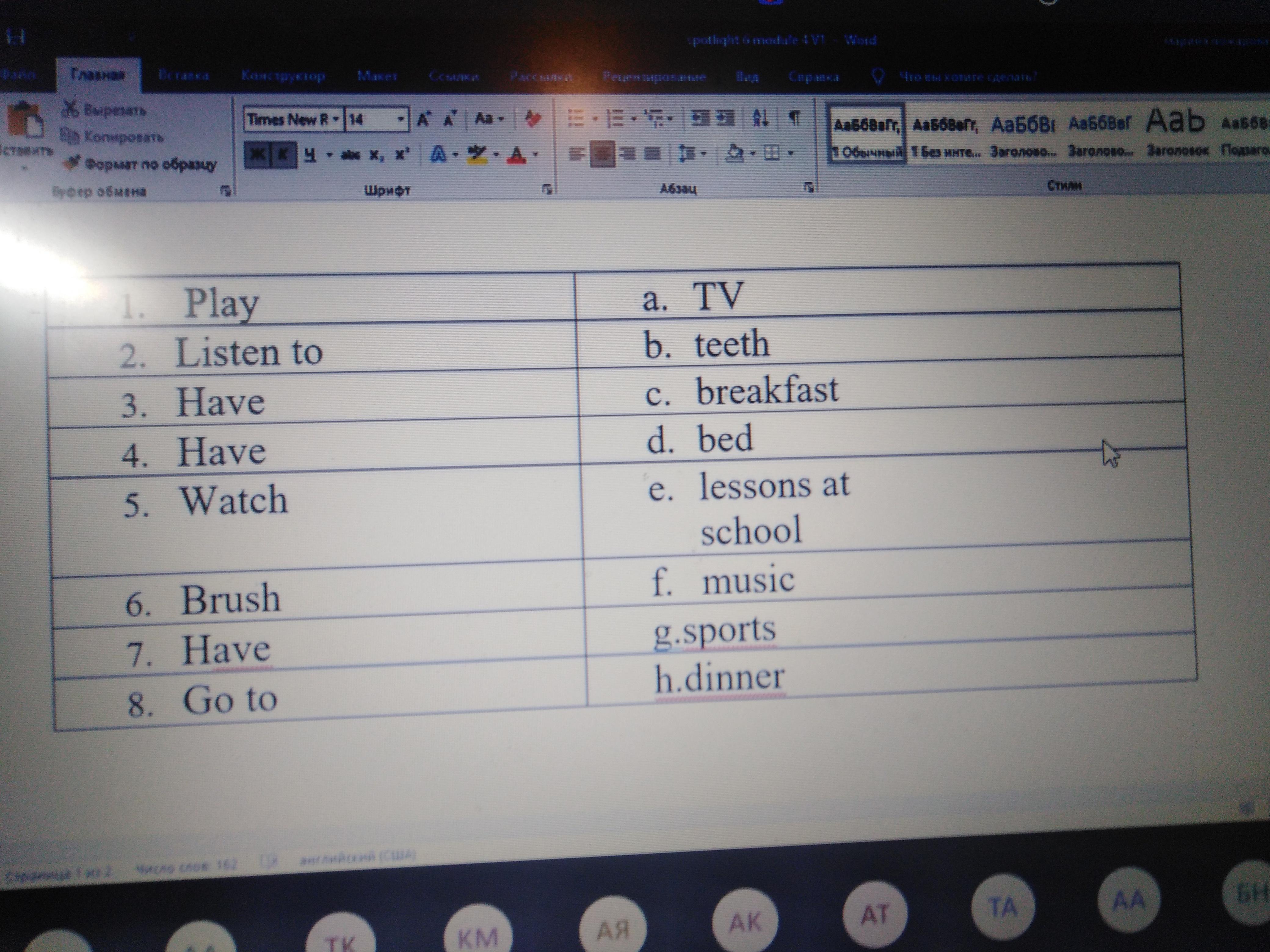 Play sports; listen to music; have a breakfast; have a dinner; watch TV; brush teeth; have lessons at school; go to bed