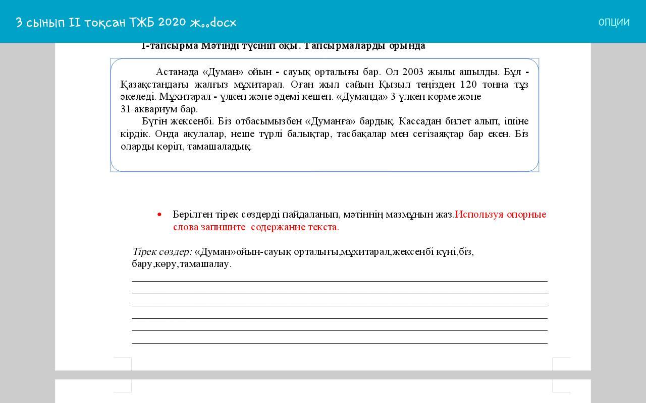 Біз жексенбі күні "Думан" ойын-сауық орталығына бардық.Біз мұхитаралға барып акулаларды,балықтарды,тағы басқа мұхитта өмір сүретін балықтарды,жануарларды көріп тамашаладық.