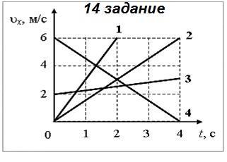 14. На рисунке изображены графики зависимости проекций скоростей на ось ОХ четырех тел от времени. С наименьшим по модулю ускорением движется тело номер...