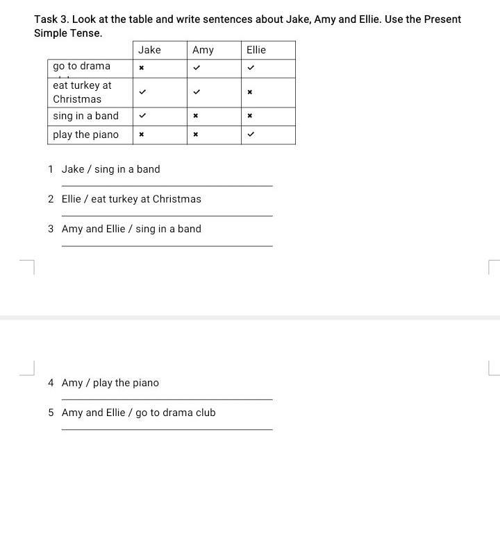 Пожалуйстаааа . Сделайййййтеее плиисссс прошууууууу. 3 задание- по таблице составить предложения, используя Present Simple. Допустим:Jake / sing in a band.