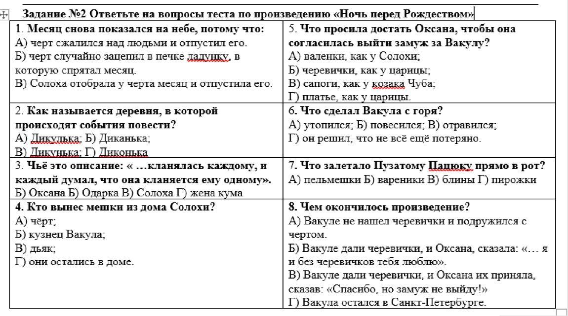 Задание №2 Ответьте на вопросы теста по произведению «Ночь перед Рождеством»