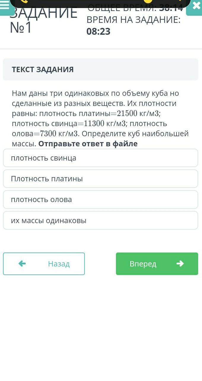 нам даны три одинаковых по объёму куба но сделаных из разных веществ их плотности равны плотность платины 21500кг/м3