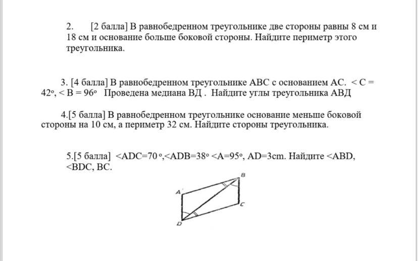 3. Медиана, проведённая в равнобедренном треугольнике также является его биссектрисой и высотой, следовательно угол АВД равен половине от угла В.