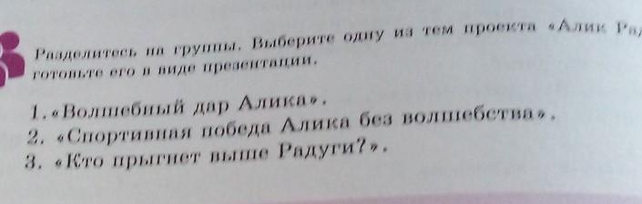 разделитесь на группы Выберите одну из тем проекта "Алик Радуга" И подготовьте его в виде презентация даю 50 балл