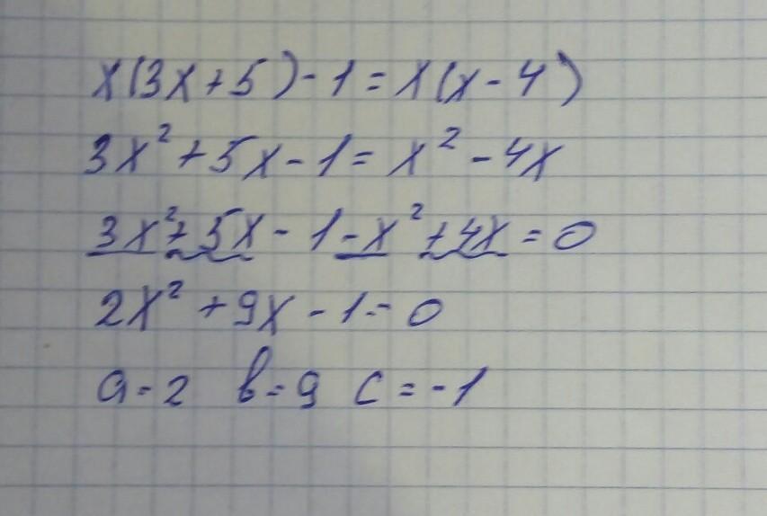 1.Преобразуйте уравнение x(3x+5)-1=x(x-4) к виду ах2 + вх + с=0 и укажите старший