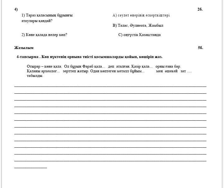 4) 26. 1) Тараз қаласының бұрынғы атаулары қандай? 2) Кене калада нелер көп? Жазылым А) сәулет өнерінің ескерткіштері В) Талас, Әулиеата, Жамбыл C) оңтүстік Қазақстанда 4-тапсырма . Көп нүктенің орнына тиісті қосымшаларды қойып, көшіріп жаз. Отырар — көне кала. Ол бұрын Фараб кала. Каланы археолог. табылды деп аталған. Қазір қала..., зерттеп жатыр. Одан көптеген металл бұйым . орны ғана бар. мен әшекей зат 56.