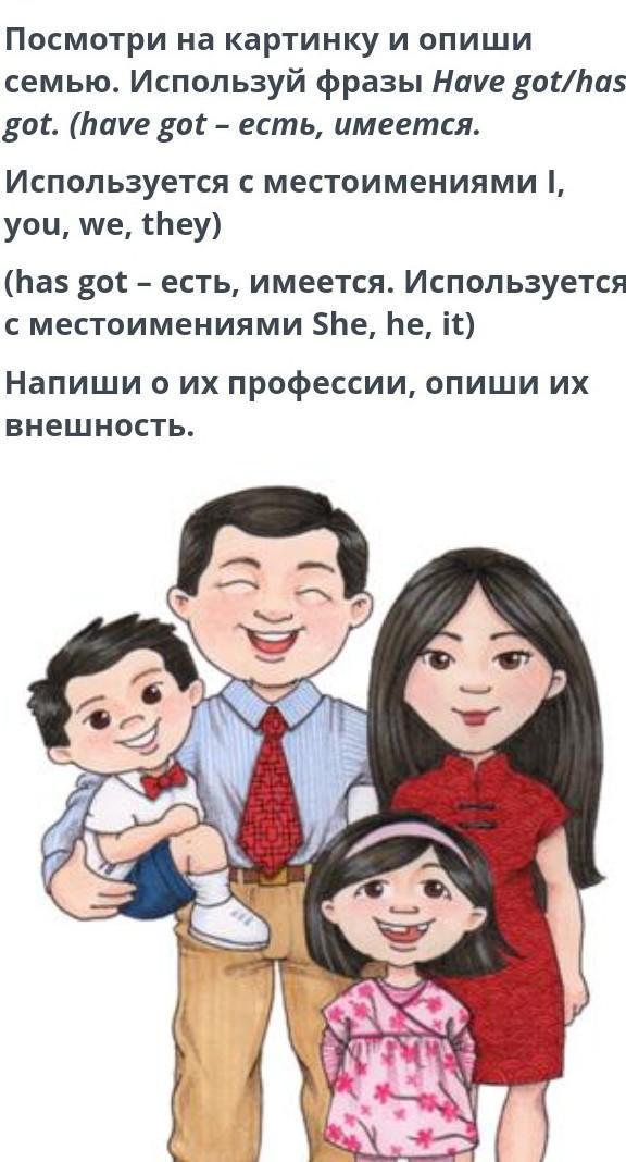 This is my family. I have (has-если мальчик) got my perfectmother,father and others. My father working (напиши в чем он работает). And our family perfect and we love our momand dad. She is not offend us, I love them