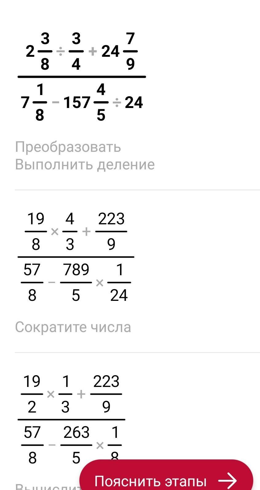 короче смешеные дроби переволи тоесть 2×8+3 поучется 19/8 если там деление ты должен перевернуть дробь и умножить потом ты ещё раз переводиш дробь и плюсуеш