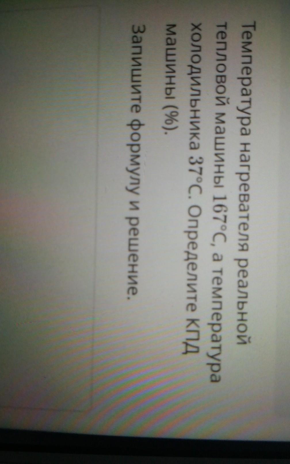 температура нагревателя идеальной тепловой машины 167 градусов а температура холодильника 37 градусов Определите КПД машины % Запишите формулу и решения