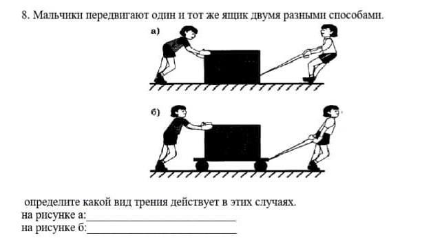 Мальчики передвигают один и тот же ящик двумя разными способами опрделить какой вид трения действует в этих случиях даю 100 баллов срочно