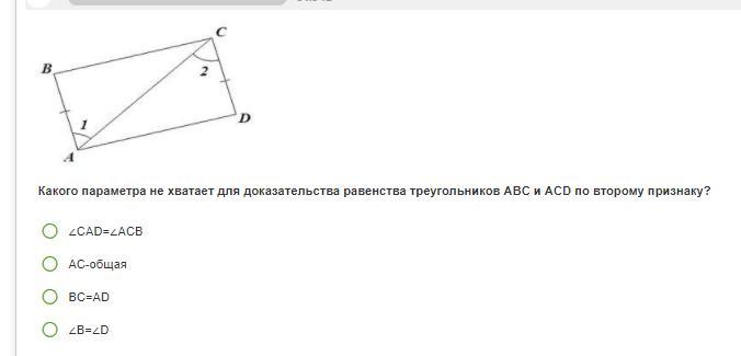 Какого параметра не хватает для доказательства равенства треугольников ABC и ACD по второму признаку?∠CAD=∠ACBАС-общаяBC=AD∠В=∠D
