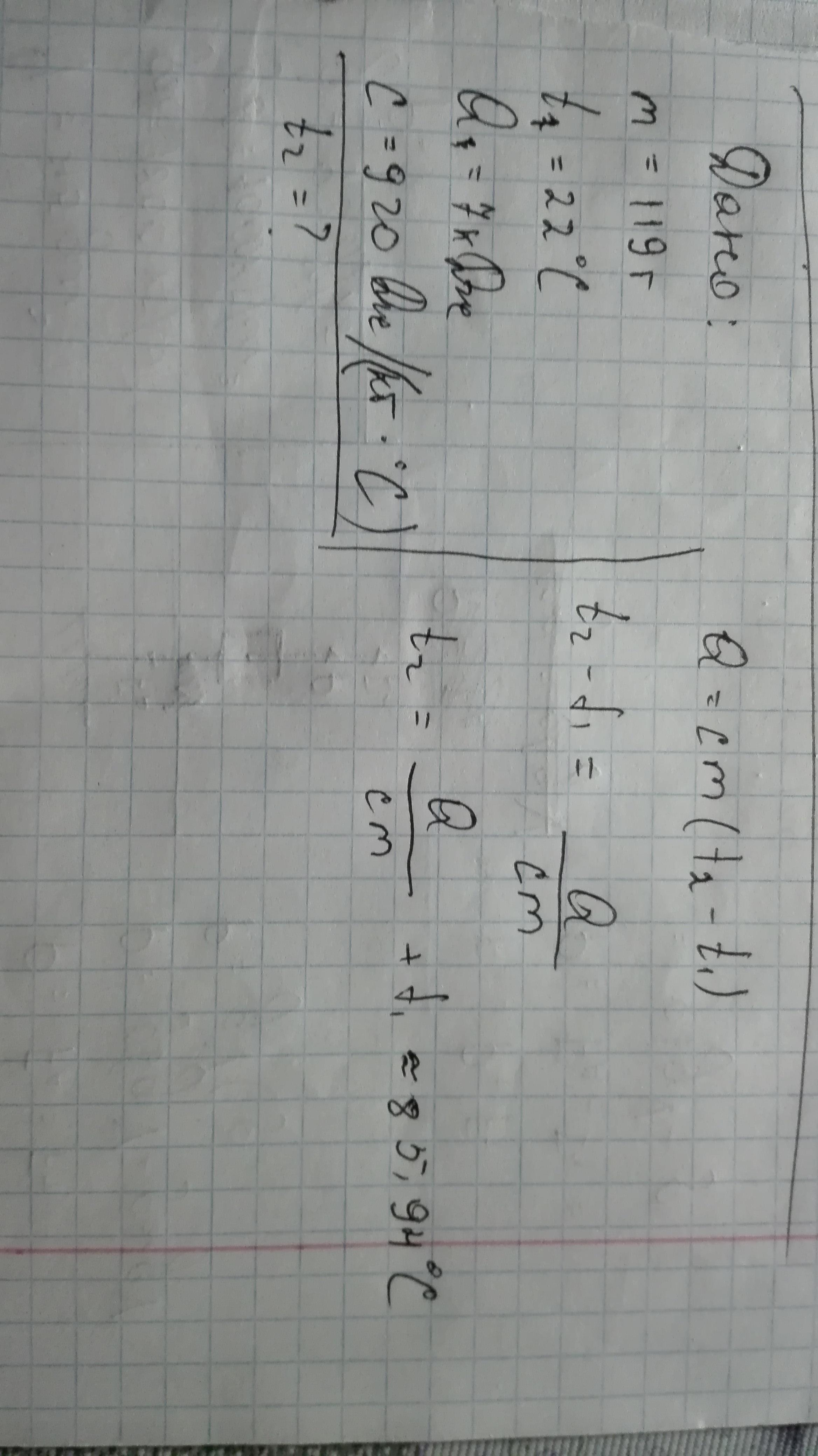 При охлаждении куска алюминия массой 119 г до температуры 22°C выделилось 7 кДж теплоты. Определи, какой была температура алюминия до охлаждения. Удельная теплоёмкость алюминия равна 920 Дж/(кг·°C).
