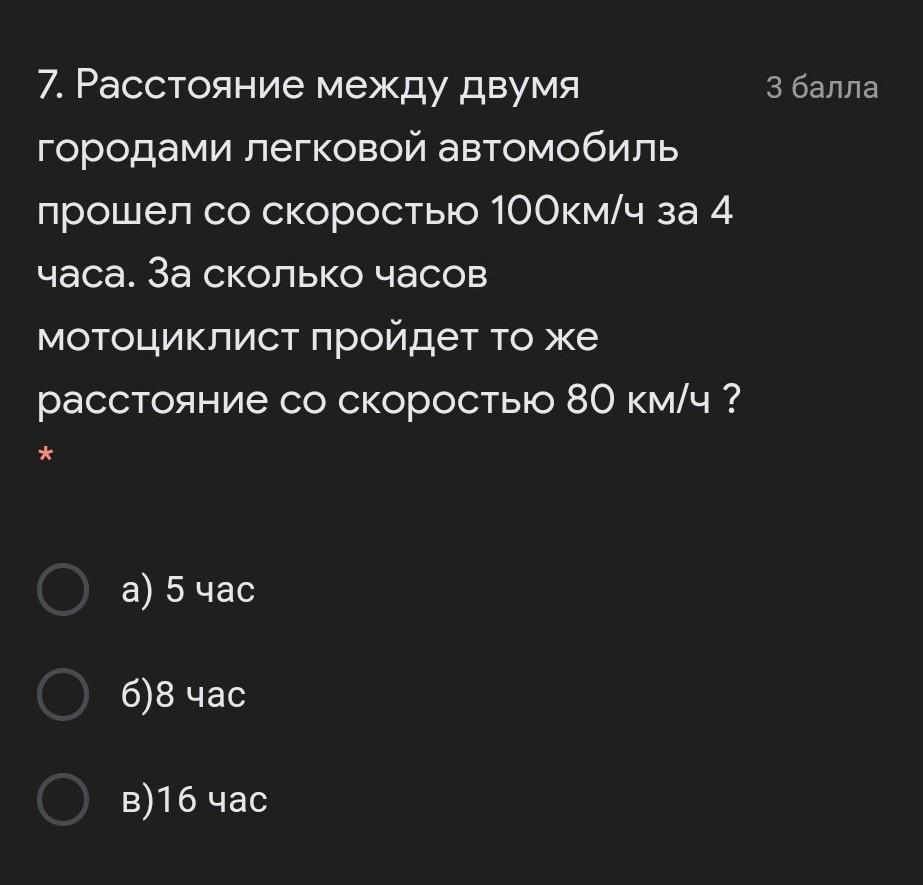 2) 400:80=5 ч - за это время мотоциклист проедет это растояние