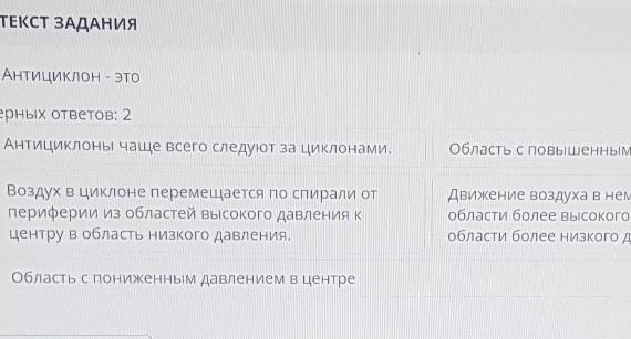 антициклон - область устойчивого повышенного атмосферного давления, располагающаяся между циклонами и связанная с сухой, малооблачной погодой.