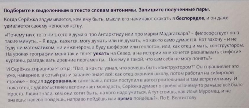 Подберите к выделенному в тексте слова антонимы точка Запишите полученные пары когда Серёжка задумываясь кем ему быть мысли его начинают скакать в беспорядке
