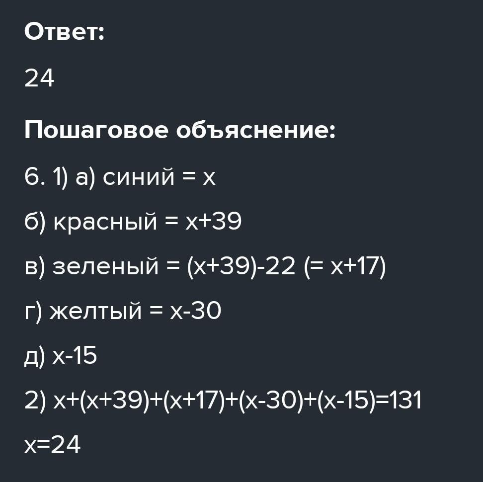 магазине упаковали в коробку 5 видов цветных кубиков : красного, синего, зеленого, желтого и белого цветов . 1) 5 балла. Составьте алгебраические выражения для количества каждого вида кубиков, если: а) х – синего цвета. б) красного на 39 видов больше, чем синих в) зеленых на 22 вида меньше, чем красных г) желтых на 30 видов меньше, чем синих д) белых на 15 видов меньше, чем синих. 2) 3 балла Зная, что количество всех кубиков равно 131 штуки, найдите количество синих кубиков в коробке, составив и решив уравнение по условию задачи.