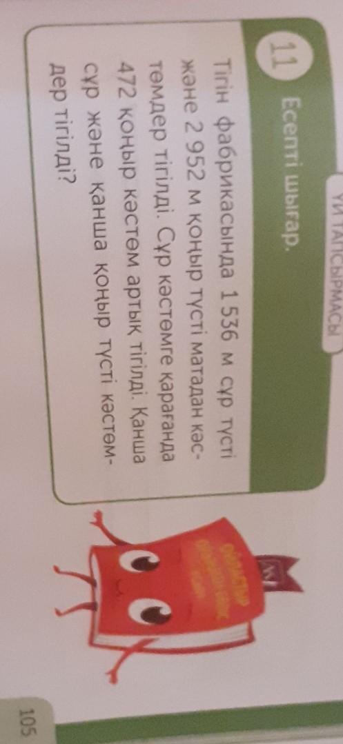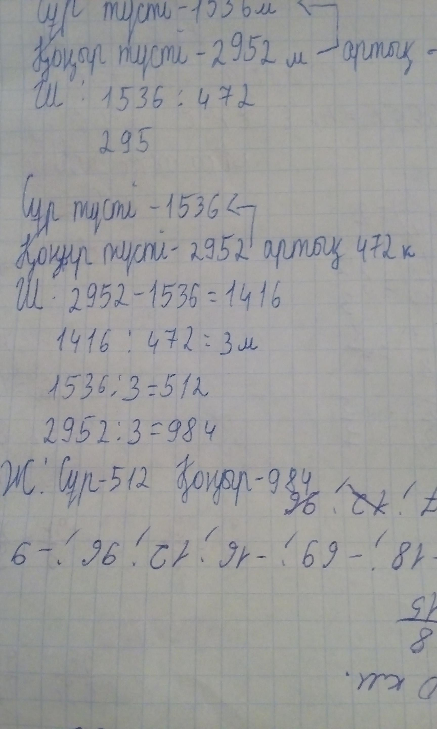 1) 2952-1536=1416м. корич. тк. пошло на 472 костюма