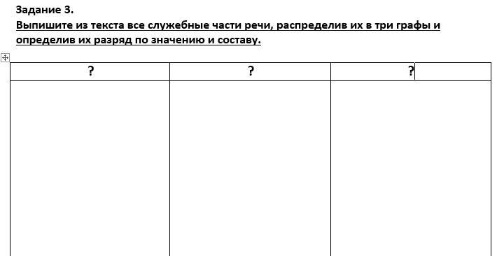 Выпишите из текста все служебные части речи, распределив их в три графы и определив их разряд по значению и составу.
