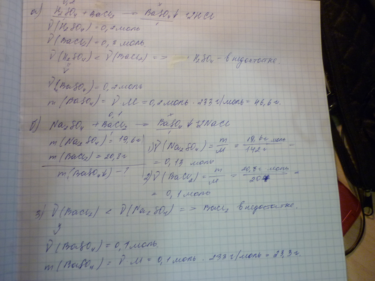 помогите плииз)определить массу осадка,образующего при взаимодействии в растворе:а)0,2 моль H2SO4 0,3 моль BaCl2б)19,6 г N2SO4 и 20,8 г BaCl2