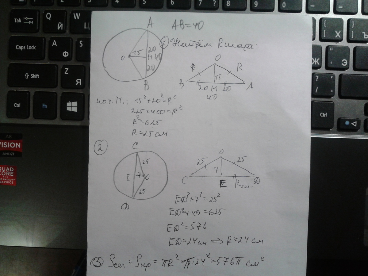 на поверхности шара выбраны точки A и B так, что AB=40 см, а расстояние от центра шара до прямой AB павно 15 см. Найдите площадь сечения шара,проведенного через точки A и B на расстоянии 7 см от центра шара.