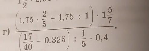 г) [(1,75 · 2/5 + 1,75 : 1) · 1 5/7] / [(17/40 - 0,325) : 1/5 · 0,4] = 21