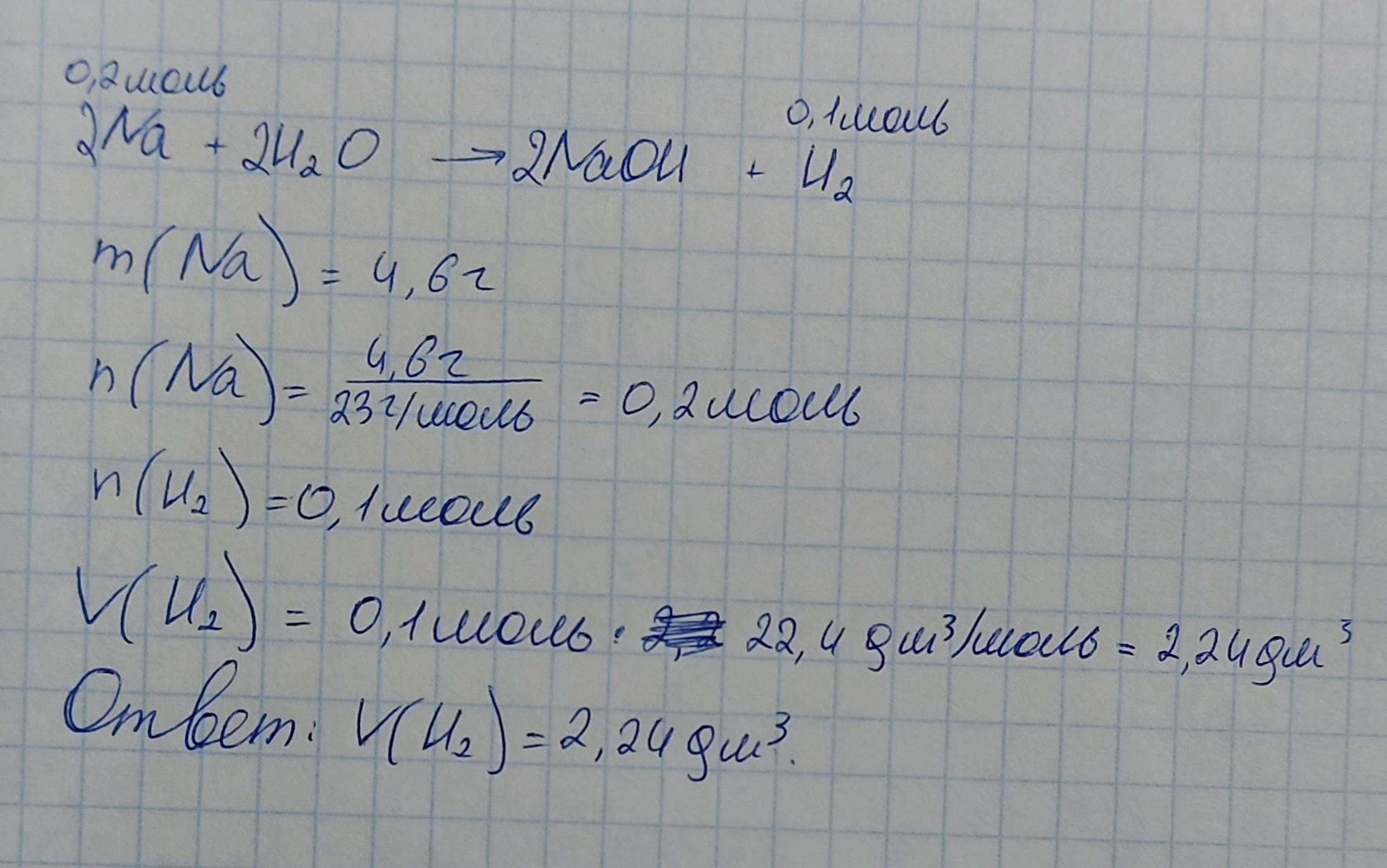 При взаимодействии натрия с водой образуется гидроксид натрия и водород. Какой объем водорода выделится, если прореагирует 4,6 г натрия?