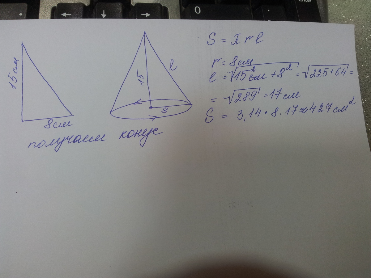 Прямоугольный треугольник, катеты которого равны 15 см и 8 см вращается возле большего катета. Найдите площадь боковой поверхности тела вращения.