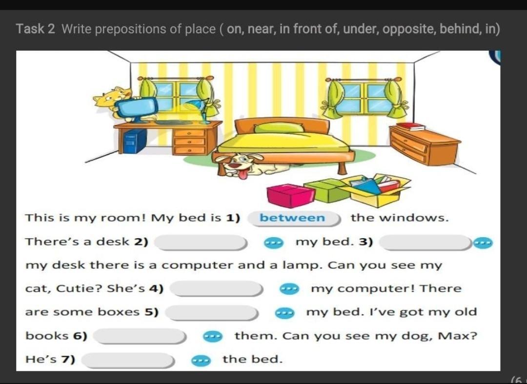 This is my room! My bed is 1) between the windows. There's a desk 2) NEAR my bed. 3) ON my desk there is a computer and a lamp. Can you see my cat, Cutie? She's 4) BEHIND my computer! There are some boxes 5) IN FRONT OF my bed. I've got my old books 6) IN them. Can you see my dog, Max? He's 7) UNDER the bed!